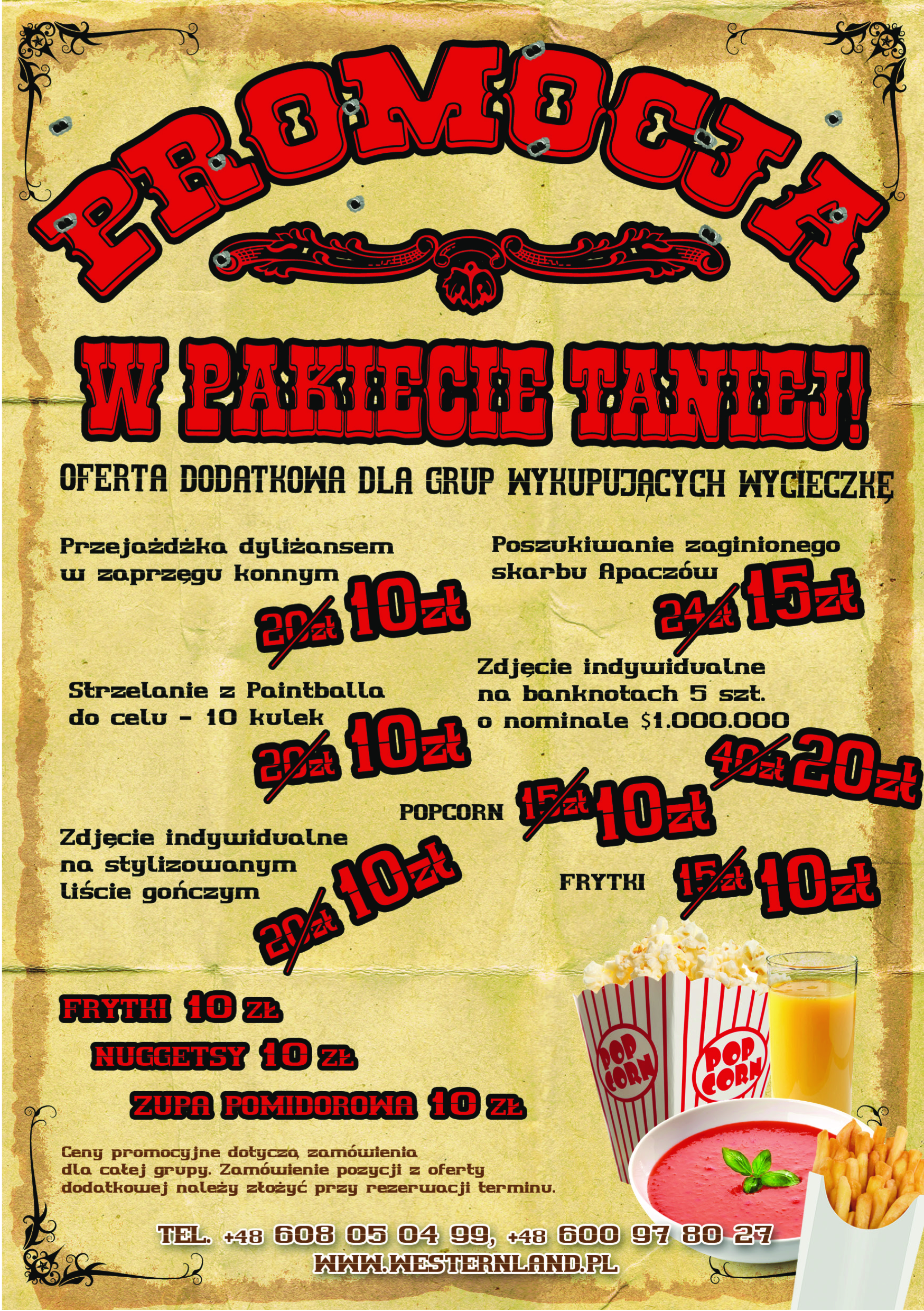 WYCIECZKA DO WESTERNLANDU Z NAJWIĘKSZĄ WIOSKĄ INDIAŃSKĄ W EUROPIE ORAZ MIASTECZKIEM LAREDO TOWN MA CHARAKTER EDUKACYJNO-REKREACYJNY. DZIECI OGLĄDAJĄ ORYGINALNE TIPI (DOMY INDIAN), TOTEMY, HISTORIE PIKTOGRAFICZNE NA SKÓRACH, ORYGINALNE STROJE, NARZĘDZIA CODZIENNEGO UŻYTKU ORAZ OBOZOWISKO TRAPERÓW I POSZUKIWACZY ZŁOTA Z WOZAMI PIONIERÓW. W FORMIE ZABAWY I FABULE WESTERNOWEJ PRZENOSZĄ SIĘ W ŚWIAT DZIKIEGO ZACHODU MINIONEJ EPOKI. OBSŁUGA JEST PRZEBRANA W ORYGINALNE STROJE KOWBOJÓW, SZERYFÓW, TRAPERÓW, ŻOŁNIERZY, INDIAN ORAZ INDIANEK.